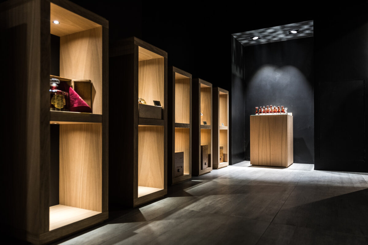 Gli arredi in rovere richiamano le pregiate botti in cui pazientemente soggiornano i nobili e profumati distillati, e la luminosità del vetro che rispecchia l’eleganza e la ricercatezza dei packaging, grazie all’uso degli incantevoli cristalli di Bohemia o delle bottiglie in sofisticato vetro soffiato, oltre che delle prestigiose cassette di legno che accolgono alcune delle più nobili referenze firmate Mazzetti d’Altavilla.