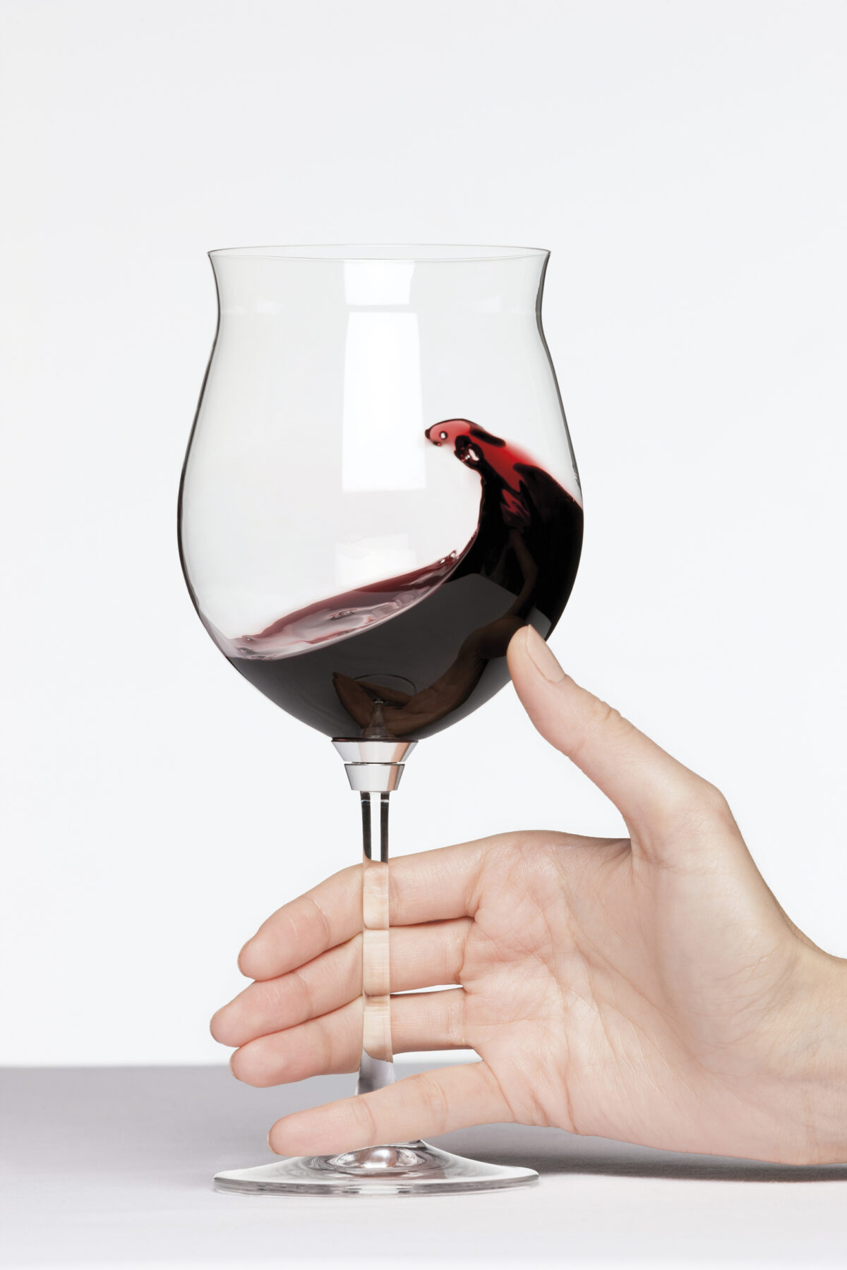 Un piccolo perno “mimetizzato” con il cristallo, oppure volutamente visibile in metallo dorato, all’apice dello stelo e alla base del calice permette, con una lieve carezza del pollice al globo, di farlo ruotare delicatamente, imprimendo un movimento morbido al vino.