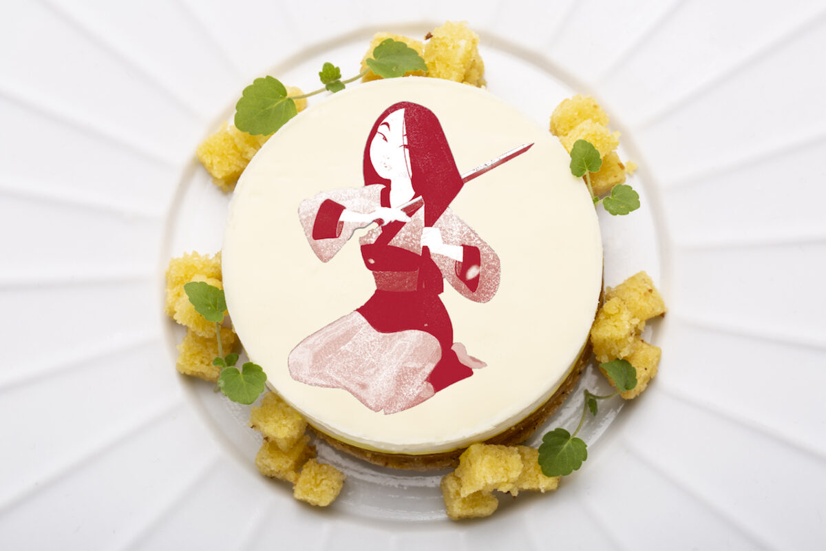 Si tratta di una monoporzione stratificata a base pan di Spagna aromatizzato al limone con gelée allo yuzu e panna cotta alla vaniglia. Come decorazione un’immagine stilizzata su una cialda sottile di cioccolato bianco che ritrae la guerriera cinese Mulan nell’atto di tagliarsi i capelli.