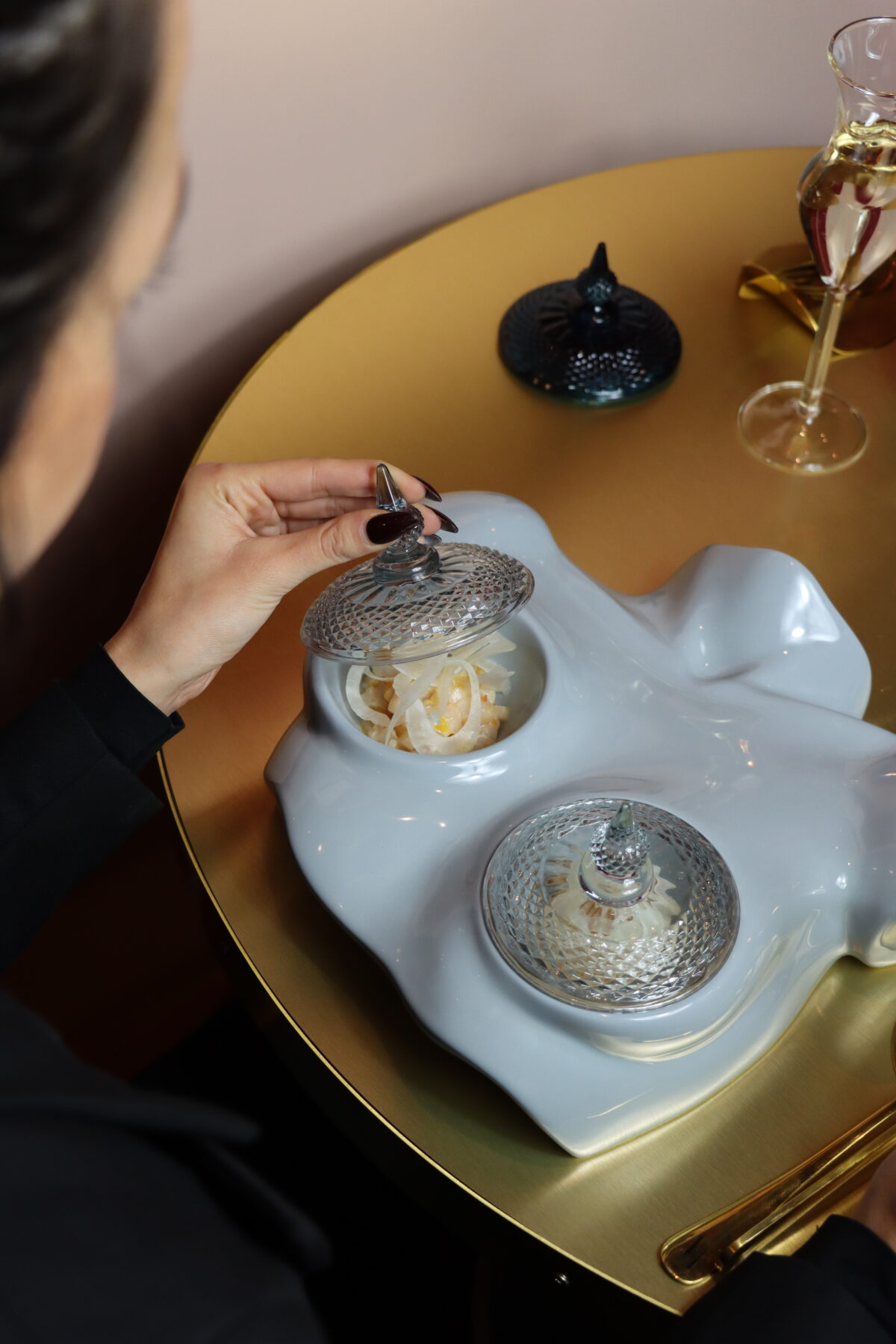Un deejay set accompagna gli ospiti ma l’intrattenimento non finisce con la musica. In diversi momenti della serata l’attenzione dal piatto è spostata sul/la dance performer ma non vi spoileriamo tutto, ci interessa di più raccontarvi il menù. Possiamo aggiungere che al piano di sotto c’è una Secret Room accessoriata, una camera del piacere, che si può prenotare anche per party privati.