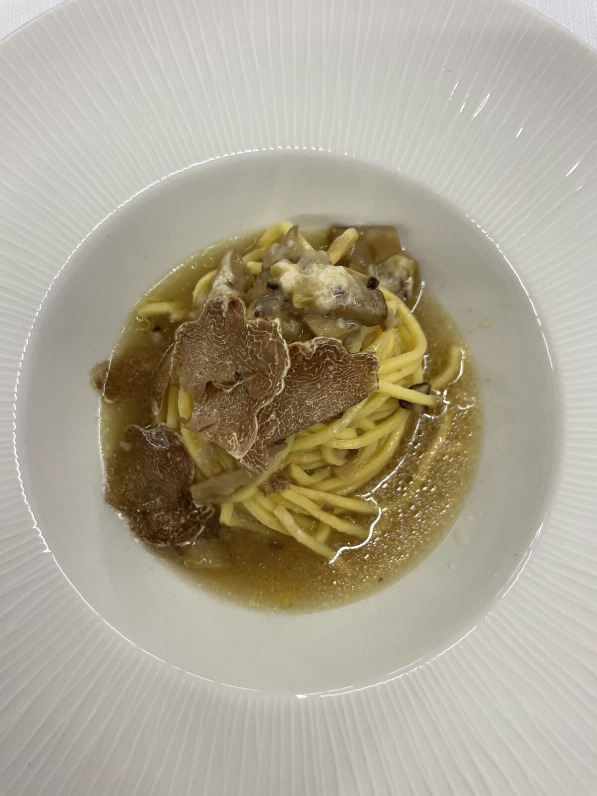 - Ramen di Spaghetti alla Chitarra con porcini, castagne, colombaccio e tartufo bianco (Alba)