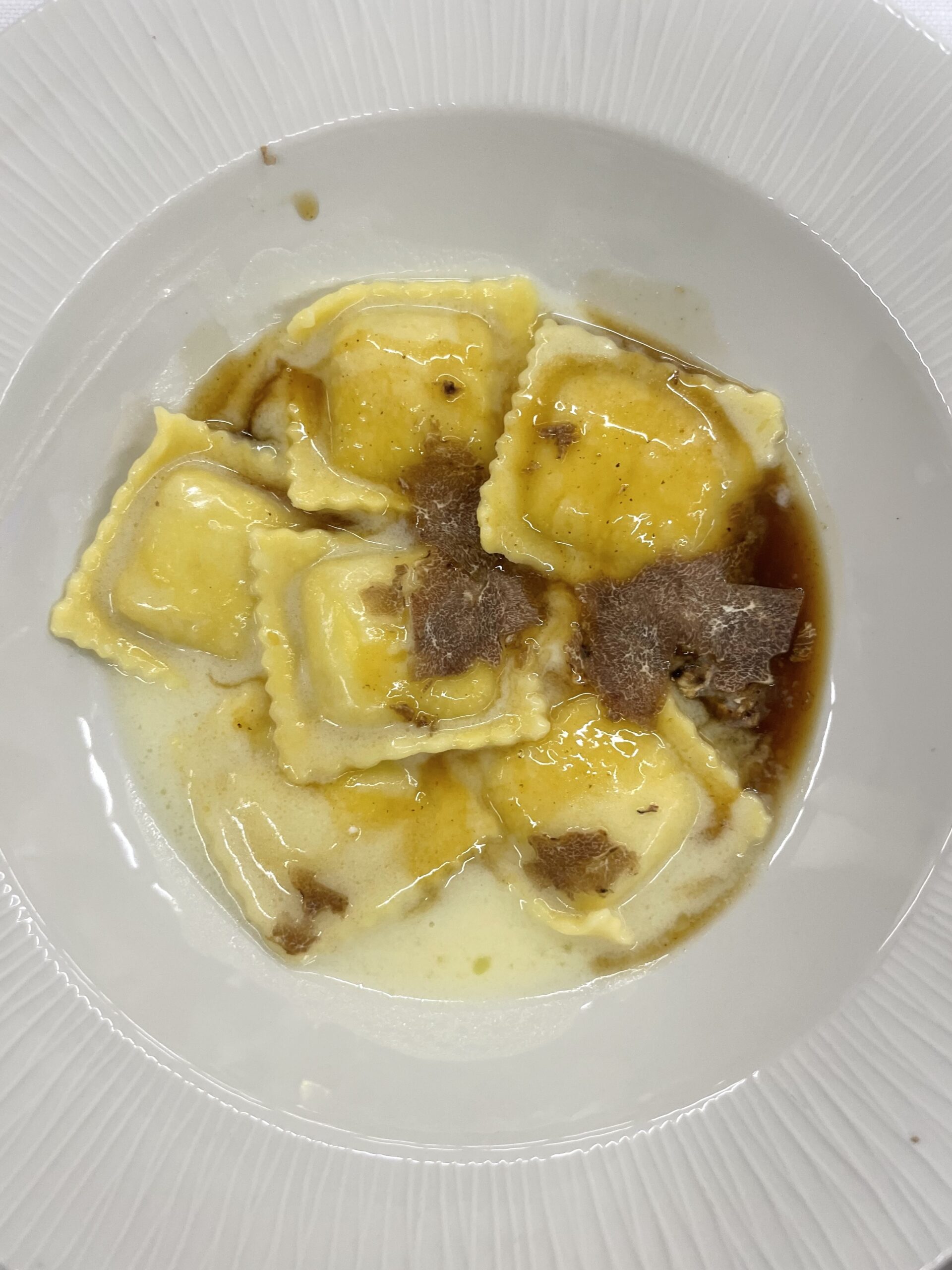 - “Il cortile e il bosco”, ravioloni al Parmigiano, cremoso di Casciotta d’Urbino DOP estratto di Faraona arrosto e tartufo bianco (Acqualagna).