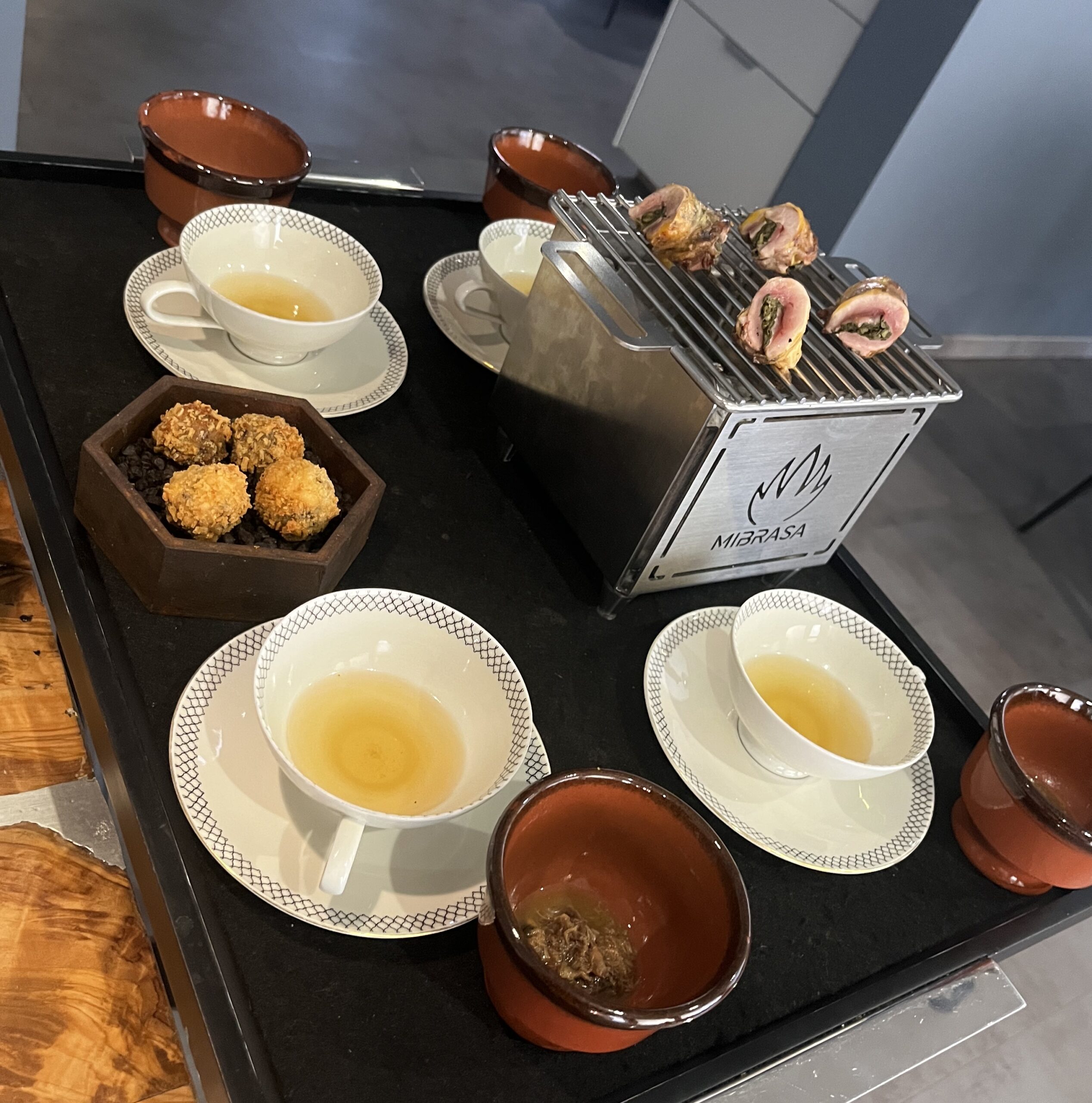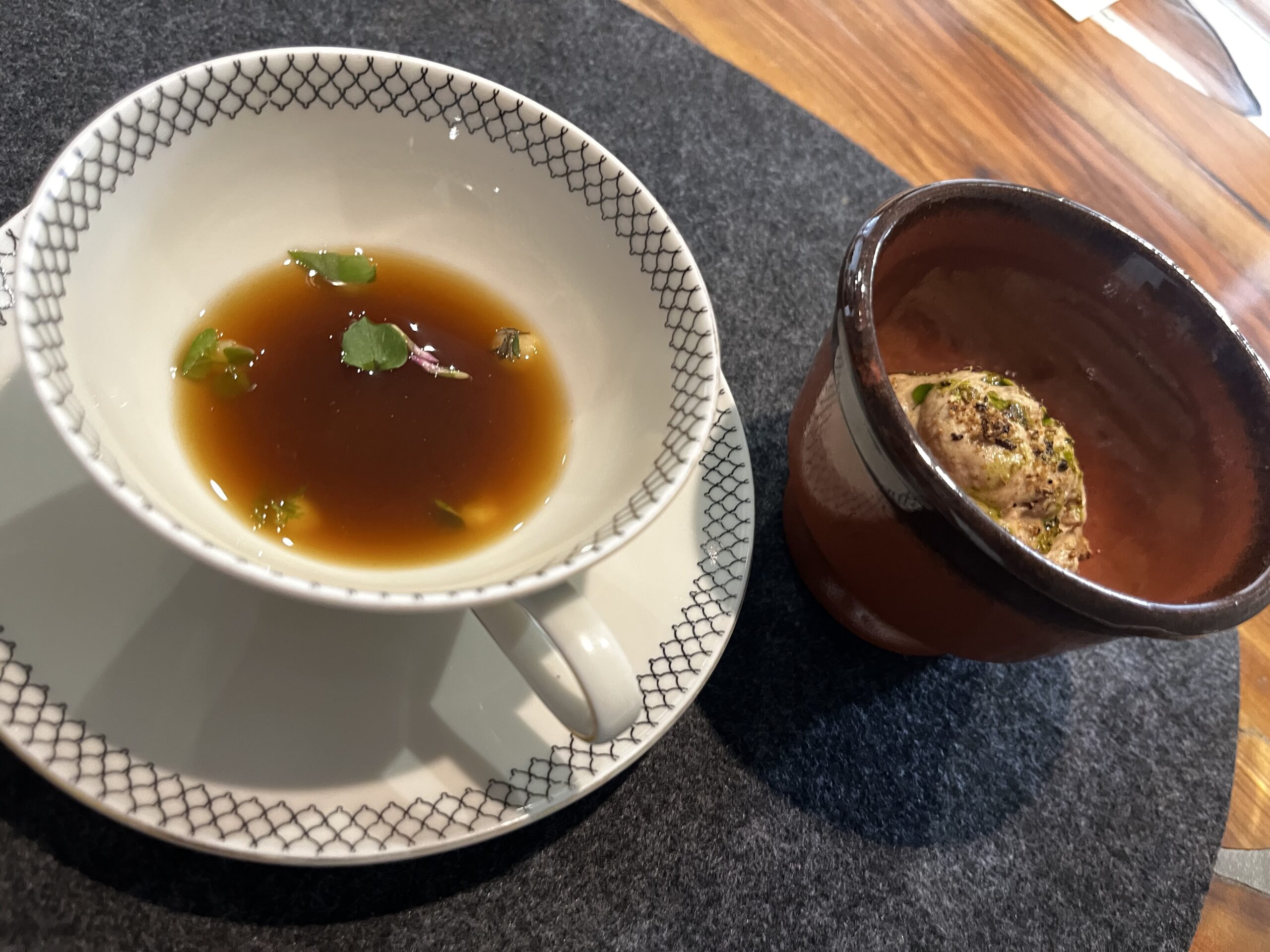 Il Brodo di selvaggina con limone e crema di funghi e mandorle.