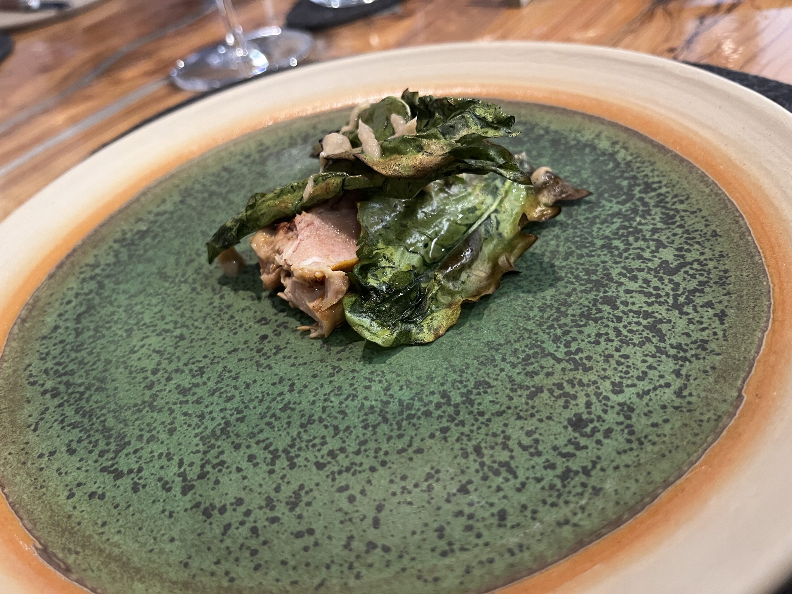 Petto al fieno cotto alla brace, cicoria e arachidi.