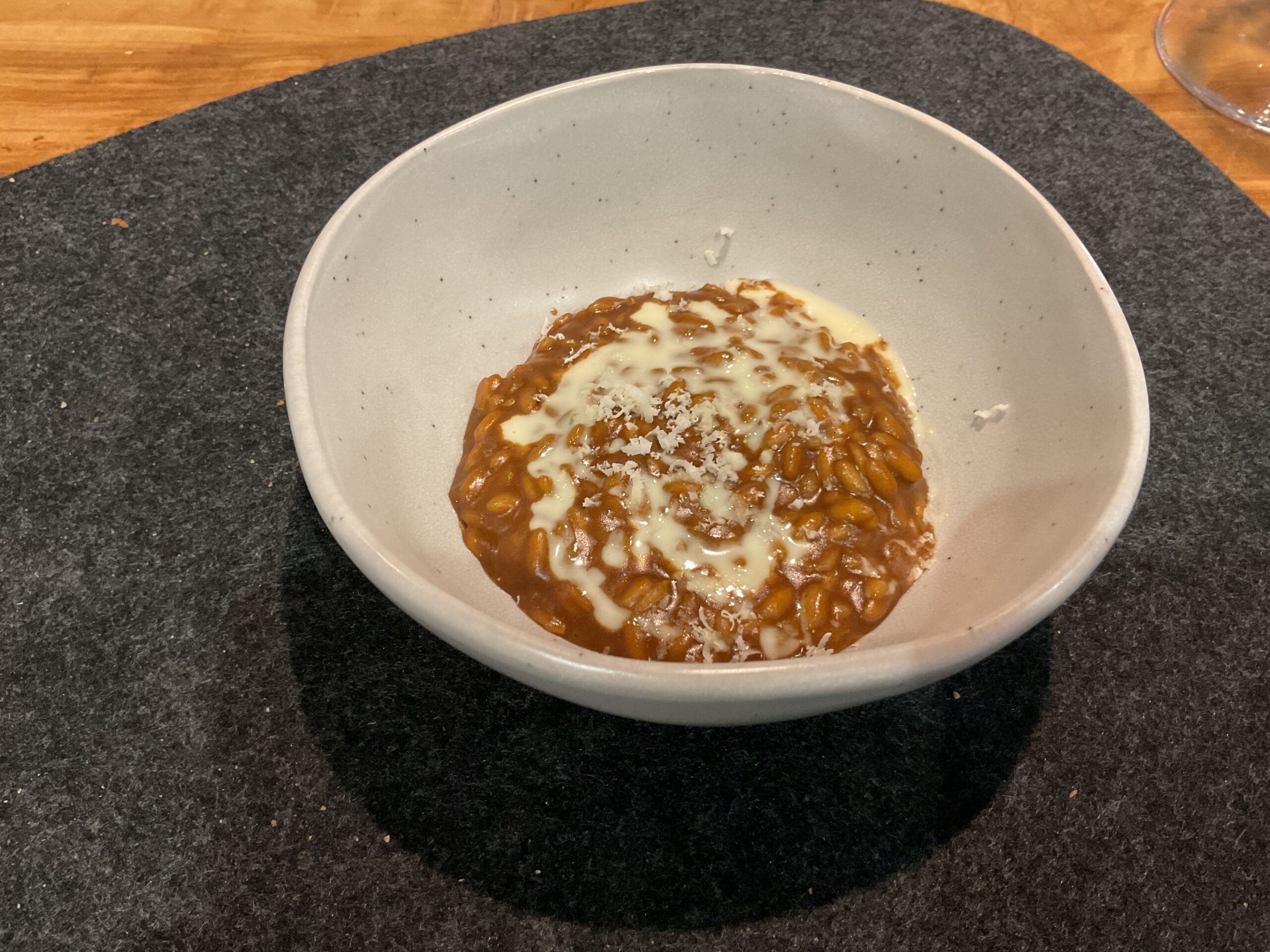 Un piatto che esprime la grande abilità dello chef nel bilanciare la complessità dell’insieme di questi elementi. Il risotto cotto alla perfezione con una cremosità che accompagna il chicco elegantemente.